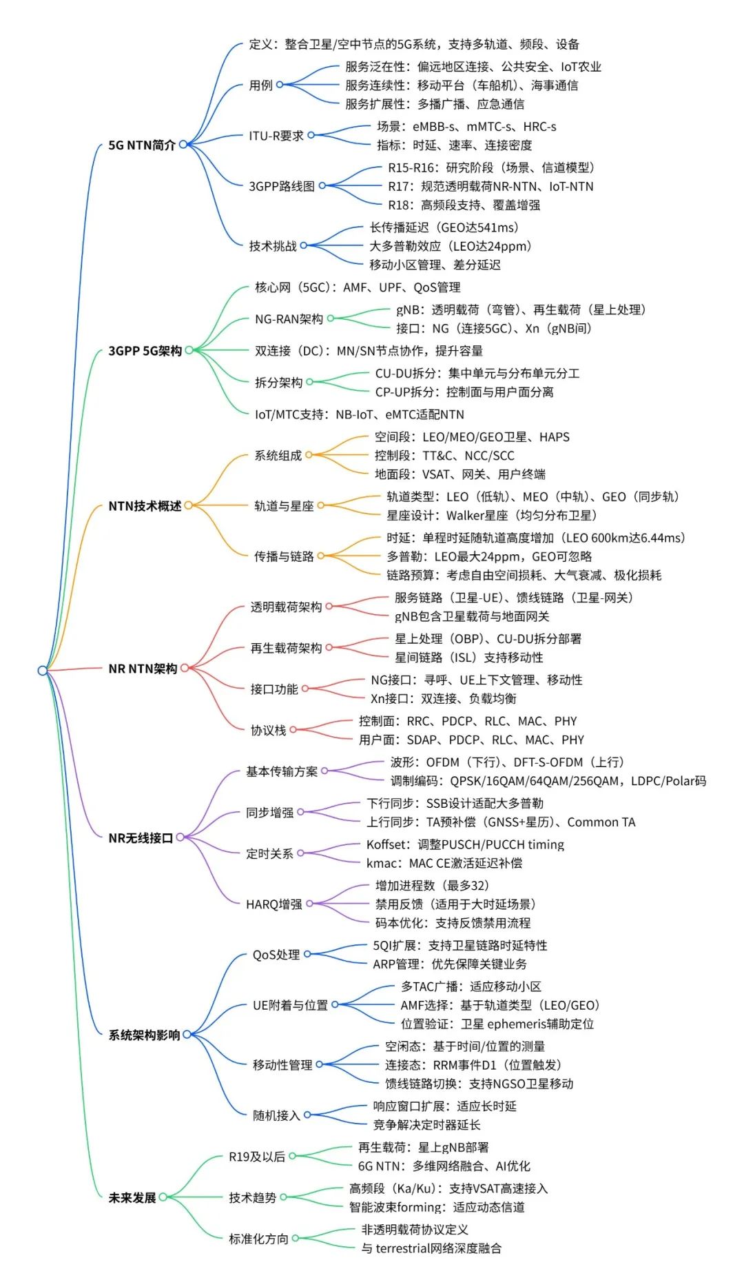 随着卫星互联网的快速建设,以及面向未来6G的空天地一体化通信网络,NTN卫星通信成为通信行业新的增长点。下面我们通过脑图,一图说明5G-NTN的技术路线与架构。
